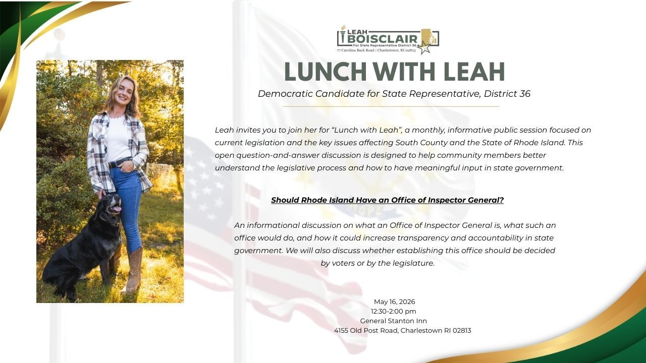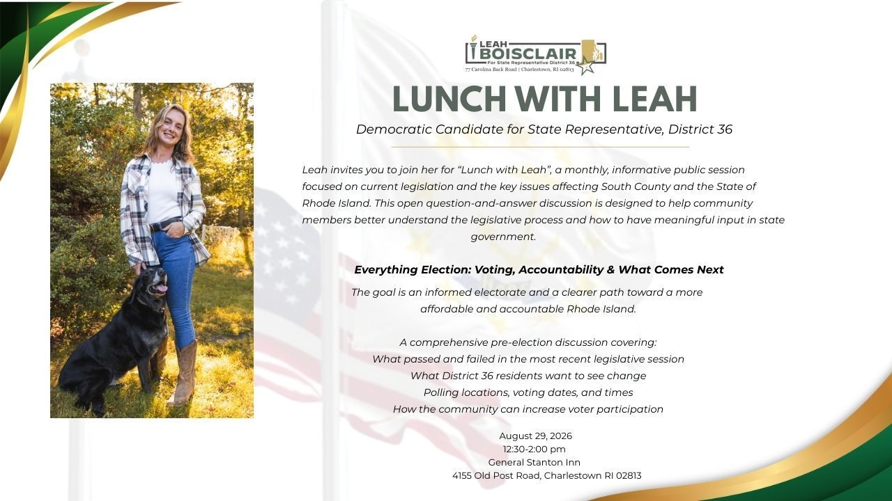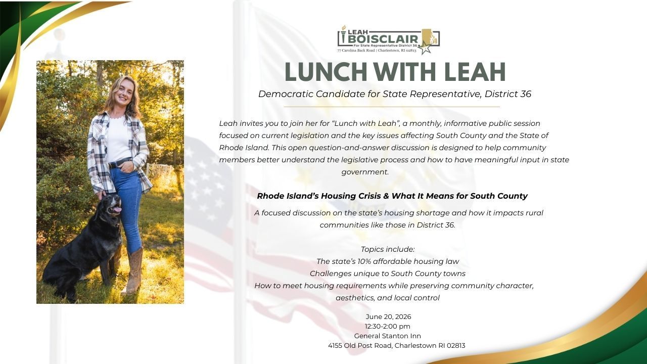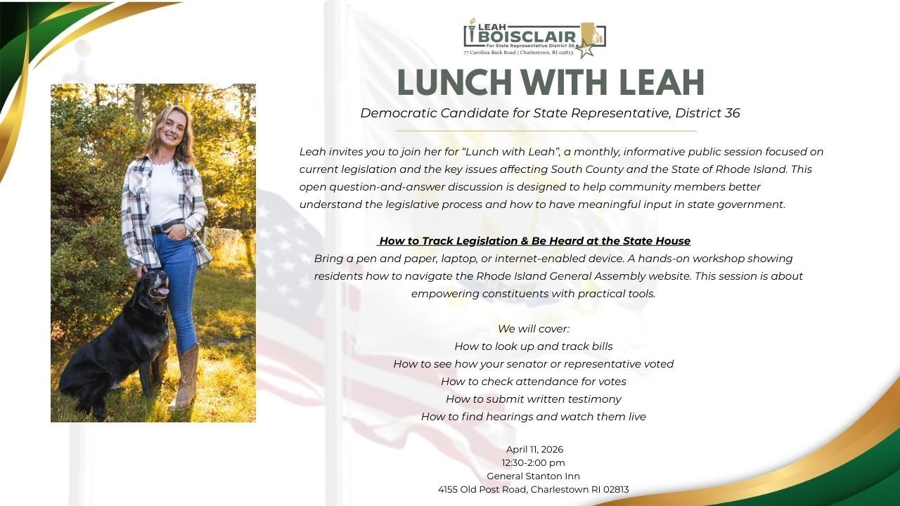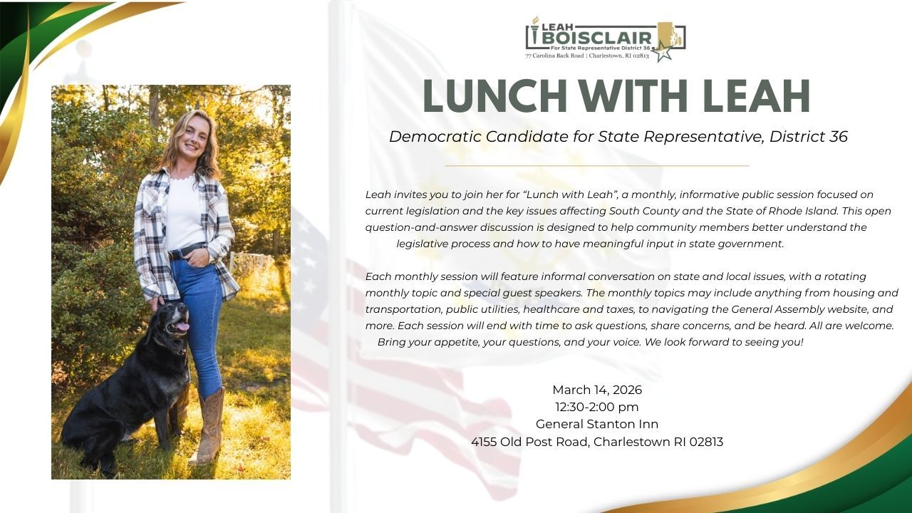 | Lunch With Leah | March 14, 2026 | 12:30-2:00pm | General Stanton Inn | 4155 Old Post Rd, Charlestown RI 02813 |