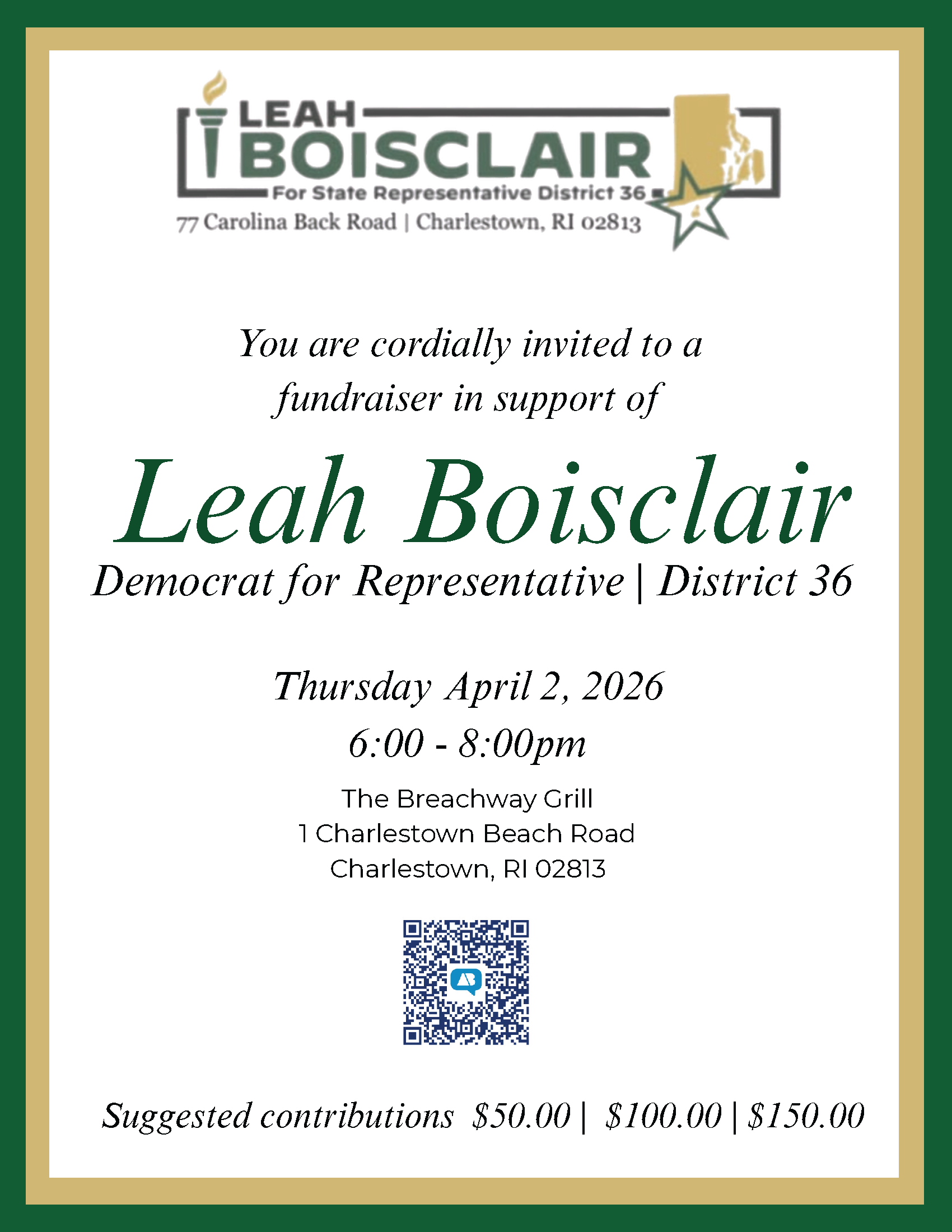 | Spring Fundraiser | April 2, 2026 | 6:00-8:00pm | The Breachway Grill | 1 Charlestown Beach Rd, Charlestown RI 02813 |